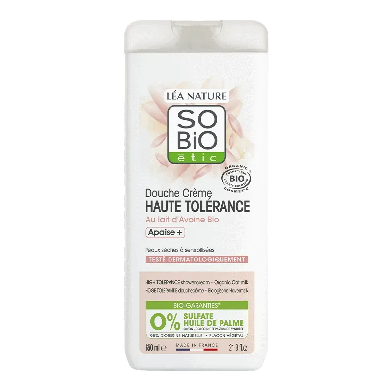 Crème de douche haute tolérance sans sulfate au lait d'avoine bio, nourrit et apaise les peaux sèches et sensibles.