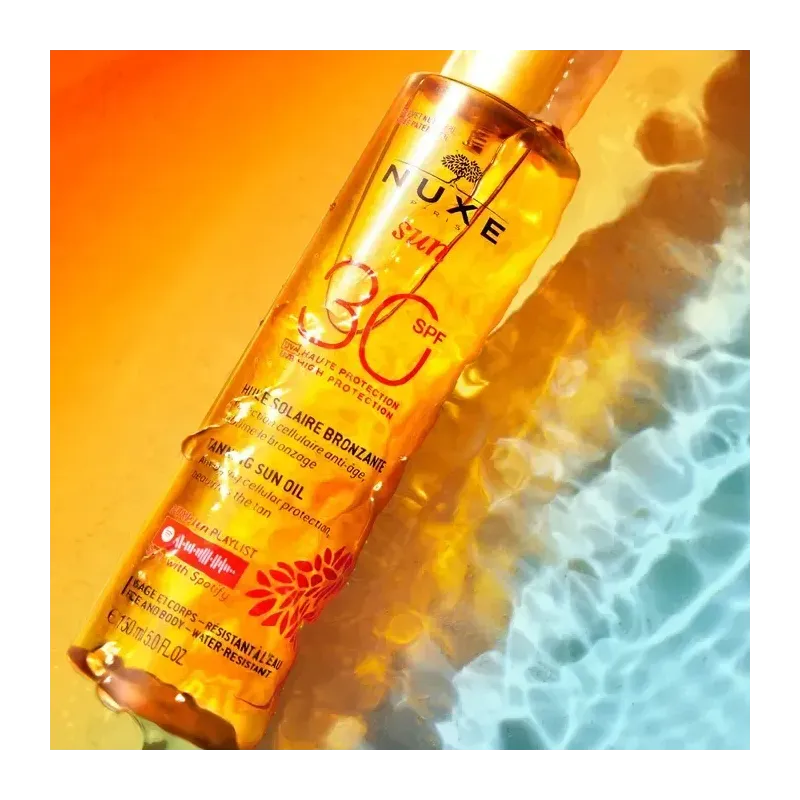 L'Huile Bronzante NUXE SUN SPF30 est un soin solaire d'exception qui allie l'efficacité d'une haute protection à la sensorialité d'une huile de soin. Sa formule est enrichie en extraits végétaux, notamment la Fleur d'Eau et le Jasmin, qui aident à protéger la peau des dommages causés par le soleil. L'Huile Bronzante NUXE SUN est plus qu'une simple protection, elle est un véritable soin embellisseur qui nourrit la peau, la rendant plus douce et plus souple. Elle est parfaite pour ceux qui aiment l'effet satiné et le parfum des huiles, sans le film gras.