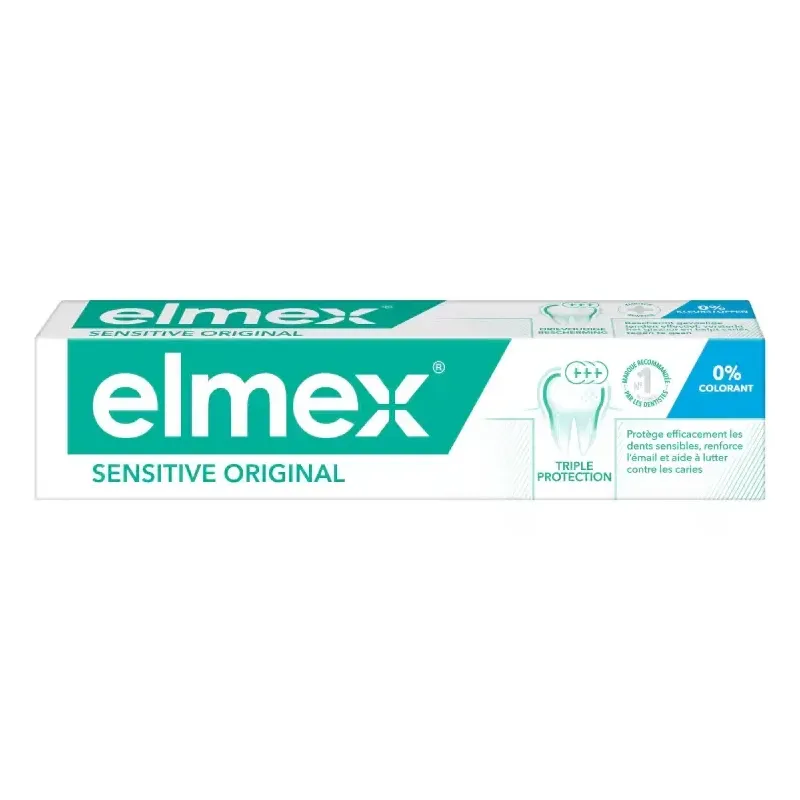 Le ELMEX DENTIFRICE SENSITIVE ORIGINAL 75ML est un dentifrice d'hygiène bucco-dentaire quotidienne spécialement conçu pour les personnes souffrant de dents sensibles et de collets dentaires dénudés. Contrairement à la formule "Professional PRO ARGIN" qui se concentre sur l'obturation immédiate des canalicules, la formule Originale d'Elmex Sensitive s'appuie sur le Fluorure d'Amines (Olafluor). Cet actif forme un film protecteur durable autour des collets dentaires dénudés. Ce bouclier a une double action : il protège contre les sensations douloureuses causées par les stimuli externes (chaud, froid, acide) et renforce l'émail en le reminéralisant pour une protection continue contre les caries, notamment les caries du collet. Il est formulé avec de fines particules nettoyantes pour un brossage doux et efficace, sans agresser les dents sensibles ni les gencives. Sa teneur en fluorure (1400 ppm F−) est adaptée à la prévention des caries.