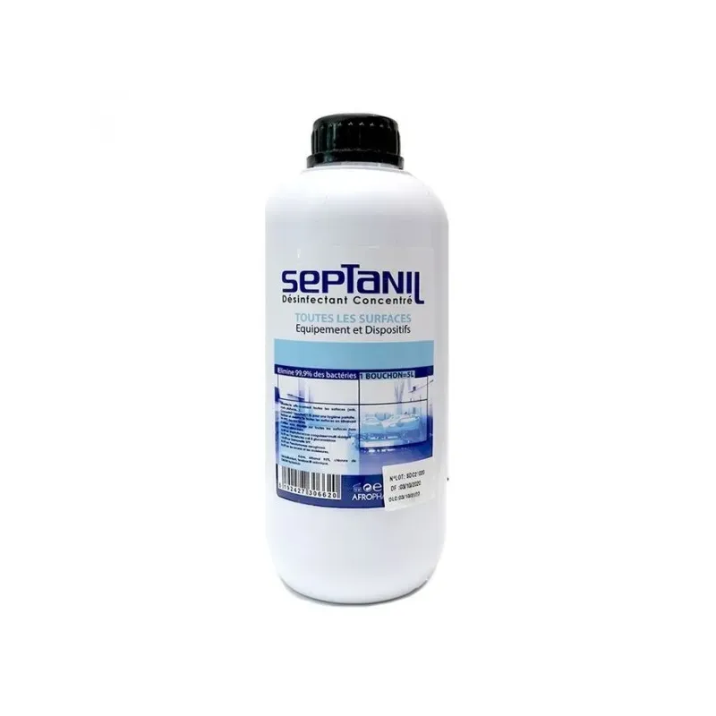 Le SEPTANIL DÉSINFECTANT SOL ET SURFACE CONCENTRÉ 1L est un produit de nettoyage et de désinfection polyvalent et économique, présenté sous forme de concentré liquide. Conçu pour être utilisé après dilution dans l'eau, il est destiné à l'entretien de tous les types de sols et surfaces dures, ainsi que des équipements et dispositifs médicaux non invasifs. Ce désinfectant concentré offre une double action nettoyante et désinfectante simultanée. Il possède un large spectre d'activité, visant à être Bactéricide, Fongicide et Virucide, assurant ainsi un niveau d'hygiène élevé. Il est apprécié pour sa capacité à nettoyer efficacement tout en laissant une odeur spécifique de propreté après application, malgré une légère mousse après dilution. Sa formule est souvent décrite comme étant biodégradable à plus de 90 %.