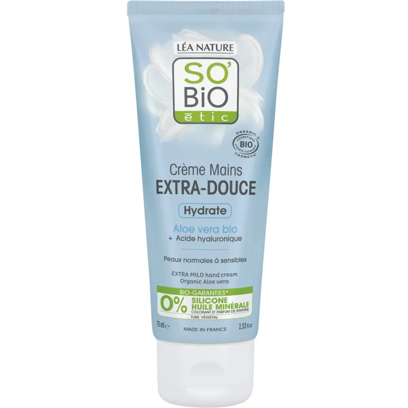 La Crème Mains Extra-Douce à l'Aloe Vera Bio de SO'BiO étic est un soin quotidien conçu pour hydrater et apaiser toutes les peaux, même les plus sensibles. Sa formule associe les vertus hydratantes et protectrices de l'Aloe Vera Bio et l'action désaltérante de l'Acide Hyaluronique naturel. Cette synergie permet à la peau de mieux retenir l'eau, assurant ainsi souplesse et confort. Elle possède une texture légère qui pénètre facilement et rapidement, sans laisser de film gras ou collant sur les mains. Elle prévient le dessèchement et contribue à maintenir l'élasticité de la peau.