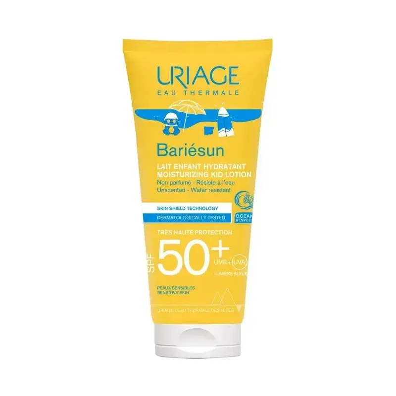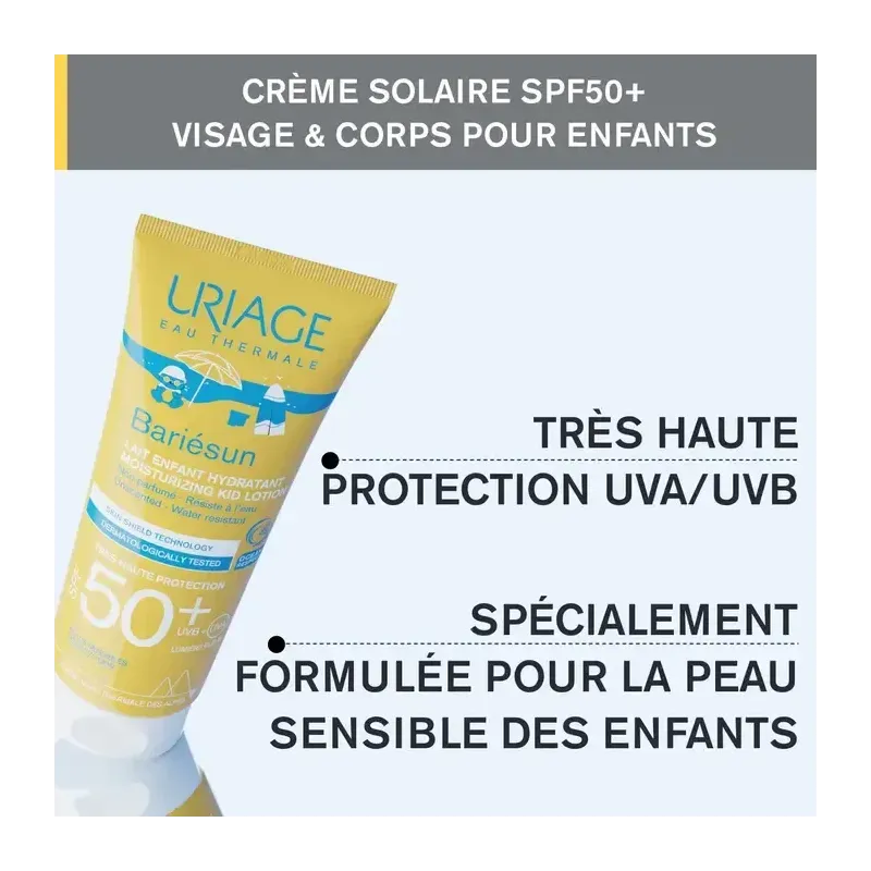 URIAGE Bariésun Lait Enfants SPF50+ 100ml est un lait solaire à très haute protection (SPF50+) spécialement formulé pour la peau délicate et sensible des enfants, offrant une défense optimale contre les rayons UV et une hydratation essentielle.