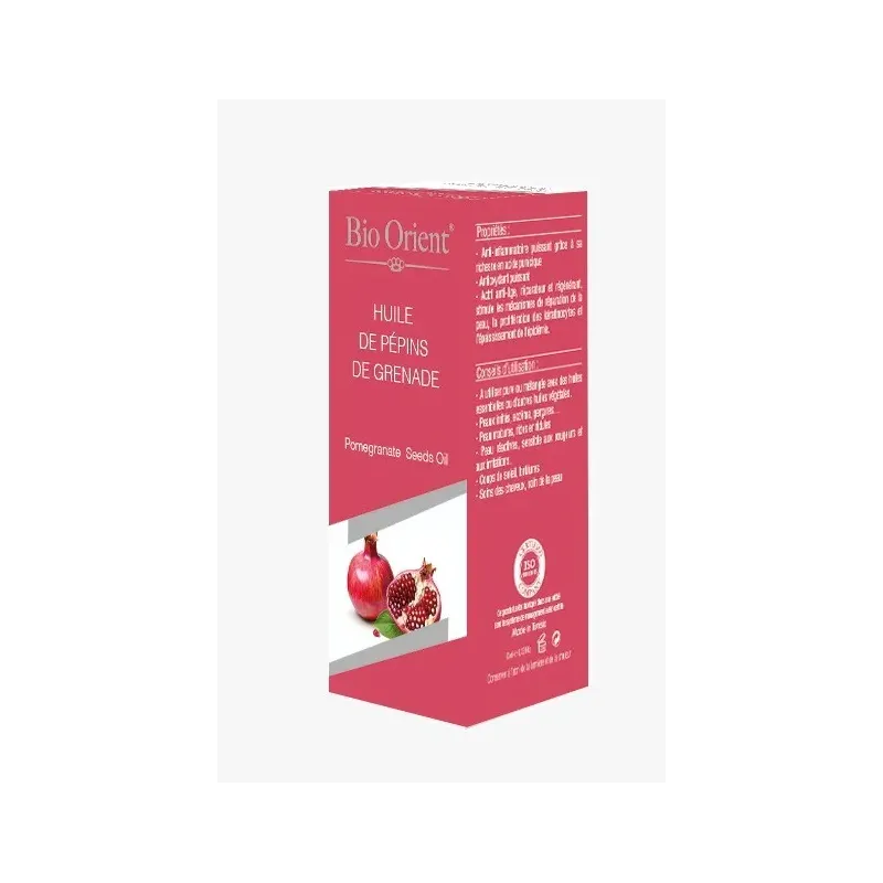 L'Huile Végétale de Pépins de Grenade de Bio Orient est un produit de soin précieux, extrait par première pression à froid des graines du fruit du grenadier (Punica granatum). Elle est particulièrement réputée pour sa concentration exceptionnelle en un acide gras unique, l'acide punicique (Oméga-5). Cette composition en fait l'une des huiles les plus performantes en matière de lutte contre le vieillissement cutané, de régénération et d'apaisement. Sa texture, bien que riche, est conçue pour être utilisée en petites quantités, notamment sur les zones délicates comme le contour des yeux, et convient parfaitement aux peaux matures, sèches ou fragilisées.