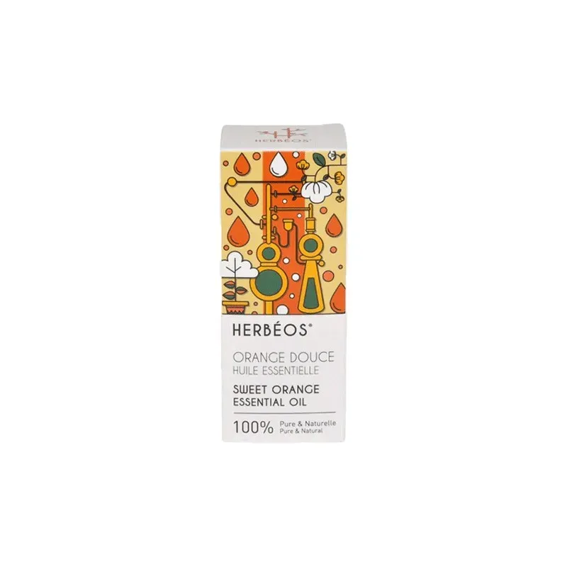 description detaillee L'Huile Essentielle d'Orange Douce (ou essence d'Orange Douce) d'HERBÉOS est obtenue par pression à froid des zestes de fruit de l'Oranger (Citrus sinensis). Son parfum frais, fruité et sucré est universellement apprécié pour créer une ambiance relaxante et joyeuse. Très riche en Limonène, elle est reconnue pour ses puissantes vertus sur le système nerveux comme calmante, sédative et anxiolytique, idéale pour favoriser le sommeil et apaiser les tensions. Elle possède également des propriétés toniques pour la peau (anti-âge, fermeté) et digestives (anti-spasmodique, carminative).