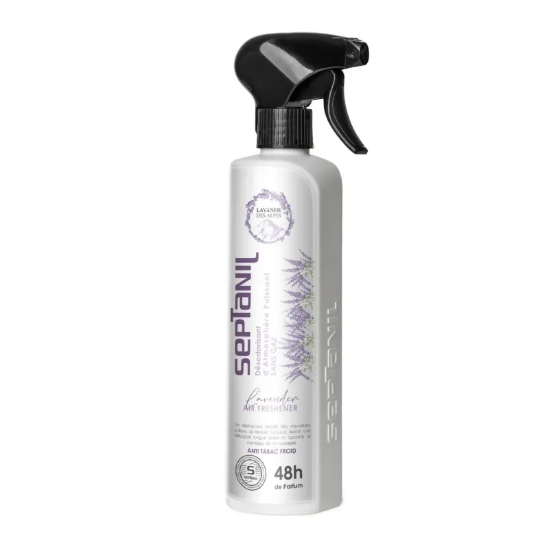 Le SEPTANIL DÉSODORISANT D'ATMOSPHÈRE PUISSANT LAVANDE D'ALPES 500ML est un spray désodorisant liquide conçu pour neutraliser efficacement les odeurs tenaces et parfumer durablement l'air ambiant et les textiles. Sa fragrance "Lavande d'Alpes" offre une senteur de lavande classique, apaisante et fraîche, inspirée des hauteurs alpines. Ce parfum est reconnu pour ses propriétés relaxantes, créant ainsi une ambiance sereine et de confort. Il se distingue par son action de destructeur d'odeurs (notamment anti-tabac froid) et sa formule puissante qui garantit une rémanence du parfum allant jusqu'à 48 heures dans les espaces confinés. Le produit est formulé sans gaz propulseur (non-aérosol), ce qui le rend plus écologique.