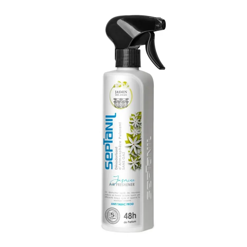 Le SEPTANIL DÉSODORISANT D'ATMOSPHÈRE PUISSANT JASMIN MACHMOUM 500ML est une solution liquide concentrée conçue pour être un destructeur rapide des mauvaises odeurs tout en assainissant l'air. Ce désodorisant se distingue par son parfum de Jasmin Machmoum, une fragrance florale intense, douce et délicate, très appréciée pour son côté envoûtant et élégant. Sa formule est puissante, mais sans gaz propulseur et écologique. Elle est spécialement élaborée pour neutraliser les odeurs tenaces (tabac, cuisine, humidité) et garantir une efficacité longue durée sur l'air ambiant et les textiles.