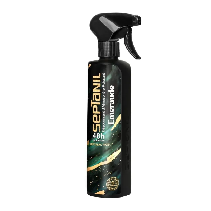 Le SEPTANIL DÉSODORISANT D'ATMOSPHÈRE PUISSANT EMERAUDE 500ML est un spray désodorisant de luxe conçu pour assainir l'air et les surfaces tout en diffusant une fragrance orientale et élégante. Souvent nommé "Oud Émeraude", son parfum est décrit comme un souffle rare et précieux, alliant la richesse et l'intensité du bois d'oud à des notes douces et ambrées, voire vertes comme le suggère le terme Émeraude. Ce produit combine une action de destructeur rapide des mauvaises odeurs (anti-tabac froid, etc.) et une efficacité olfactive longue durée. Grâce à sa formule exclusive et sans gaz propulseur (non-aérosol), il garantit une ambiance élégante, captivante et durablement fraîche dans divers environnements.
