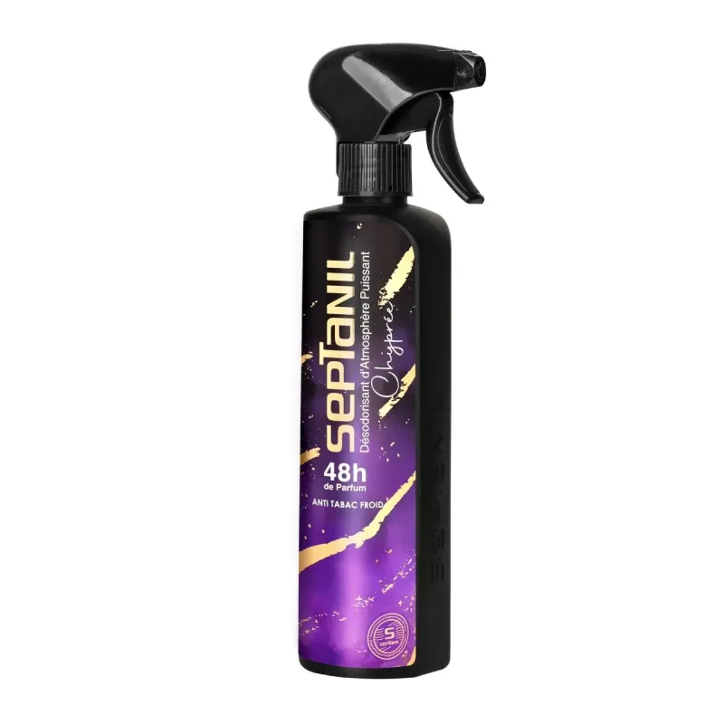 Le SEPTANIL DÉSODORISANT D'ATMOSPHÈRE PUISSANT CHYPRÉE 500ML est une brume d'ambiance concentrée et sophistiquée, présentée dans un flacon pulvérisateur. Il est conçu pour être un destructeur rapide et puissant des mauvaises odeurs (y compris le tabac froid), tout en diffusant une fragrance de type Chyprée. Le parfum Chypré est une signature olfactive envoûtante, noble et raffinée, caractérisée par un mélange harmonieux de notes fraîches (agrumes), d'un cœur floral délicat et d'un fond boisé, mousseux et sensuel (mousse de chêne, patchouli). Ce désodorisant sans gaz propulseur laisse un sillage élégant et durable, garantissant une efficacité de longue durée dans tous les espaces. Il est idéal pour transformer l'atmosphère en un lieu accueillant, élégant et inoubliable.