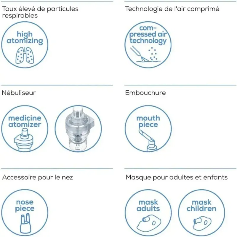 Technologie efficace : La technologie à air comprimé garantit une nébulisation rapide et efficace. Le taux de nébulisation élevé (> 0,25 ml/min) et la taille de particule fine (MMAD 4,12 µm) assurent une pénétration optimale du médicament dans les voies respiratoires.