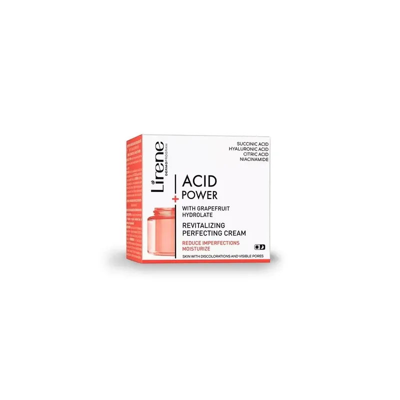 La LIRENE ACID POWER REVITALIZING PERFECTING CREAM 50ML est une crème de soin hydratante et revitalisante de la gamme Acid Power, spécialement formulée pour les peaux présentant des imperfections, un teint irrégulier, des pores dilatés ou des marques post-acné. Sa formule innovante repose sur une combinaison d'acides professionnels et d'ingrédients apaisants. Elle agit par une exfoliation douce et non agressive pour stimuler le renouvellement cellulaire et lisser le grain de peau, minimisant ainsi l'apparence des pores, des taches et des irrégularités pigmentaires. Elle est enrichie en ingrédients hydratants et nourrissants pour restaurer l'hydroéquilibre de la peau, la laissant plus douce, plus lisse et visiblement plus lumineuse.