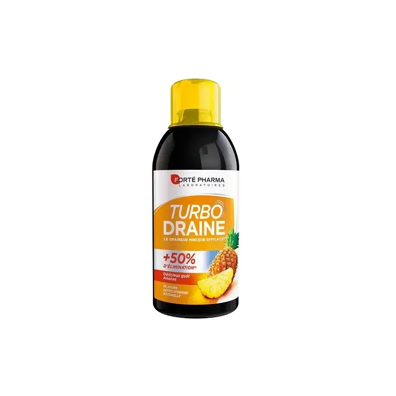 Forté Pharma Turbodraine Ananas 500ml est une solution buvable conçue pour vous aider à drainer l'excès d'eau, à détoxifier l'organisme et à soutenir votre perte de poids. Son agréable goût ananas facilite sa consommation. Idéal pour les sensations de gonflement ou les jambes lourdes. Sa formule est enrichie en actifs végétaux comme la Reine des Prés et la Queue de Cerise pour l'élimination rénale, le Thé Vert pour stimuler le métabolisme et brûler les graisses, l'Hibiscus pour le drainage, le Pissenlit pour ses propriétés diurétiques, et l'Artichaut pour la détoxification. L'Ananas apporte aussi des enzymes et des fibres complémentaires. Ce draineur aide à réduire la rétention d'eau et à affiner la silhouette, complétant ainsi une alimentation équilibrée et une activité physique régulière.