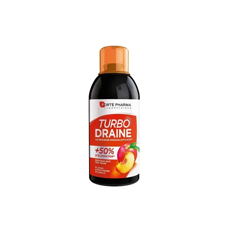 Forté Pharma Turbodraine Minceur Pêche favorise l'élimination de l'eau et des toxines. Il réduit les sensations de gonflement et de jambes lourdes. Il contribue à une silhouette affinée et à la perte de poids. Sa formule contient un complexe de plantes drainantes, brûle-graisses et détoxifiantes (Reine des Prés, Queue de Cerise, Thé Vert, Hibiscus, Pissenlit, Artichaut). Son goût agréable de pêche facilite sa consommation quotidienne.