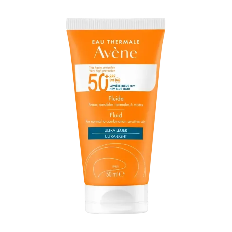 L'AVENE FLUIDE ULTRA LÉGER SPF50+ PEAUX SENSIBLES NORMALES À MIXTES 50ML est une protection solaire quotidienne très haute performance, spécialement conçue pour le visage des peaux sensibles, normales à mixtes. Ce flacon de 50 ml offre une protection solaire ultra large spectre qui va au-delà des UV, protégeant également de la lumière bleue, reconnue comme un accélérateur du vieillissement cutané.