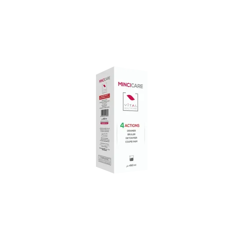 VITAL MINCICARE 4 ACTIONS 450ML est une solution buvable spécialement formulée pour accompagner un régime amincissant. Ce complément alimentaire se distingue par sa formule concentrée qui agit sur quatre fronts pour favoriser la perte de poids : il draine, brûle les graisses, modère l'appétit et favorise le transit. Sa composition, riche en extraits de plantes reconnues pour leurs propriétés amincissantes, en fait un allié pour affiner la silhouette de manière globale et progressive.