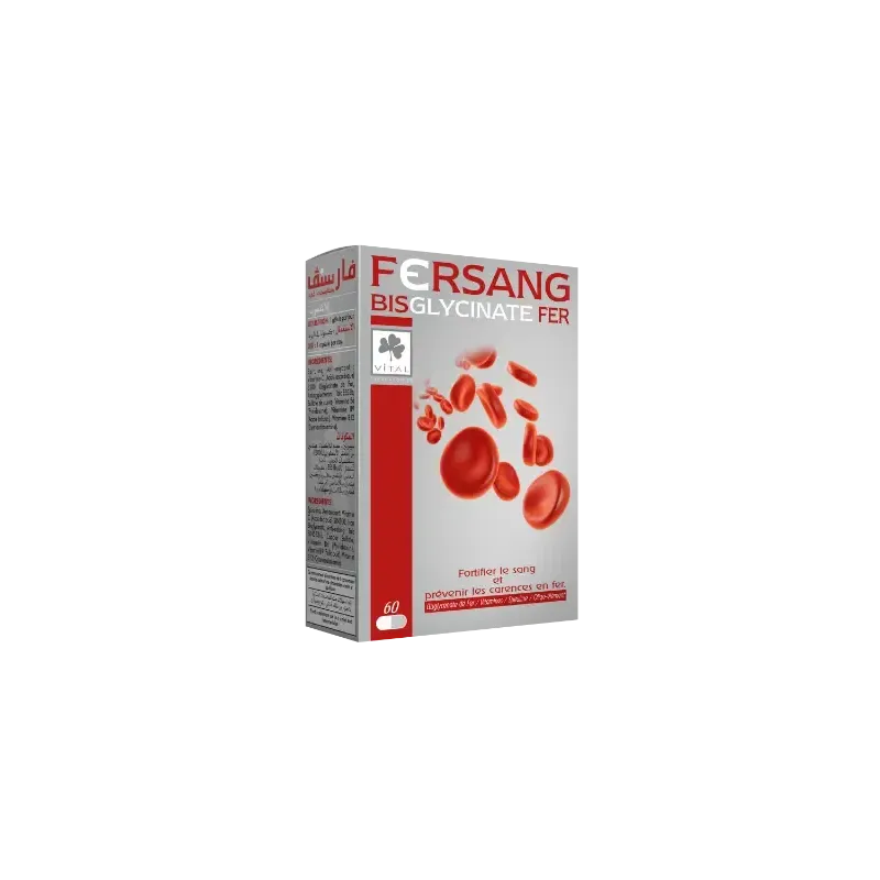 VITAL FERSANG BISGLYCINATE IRON 60 GÉLULES est un complément alimentaire conçu pour les personnes souffrant de carence en fer. Ce produit se distingue par l'utilisation du bisglycinate de fer, une forme de fer hautement biodisponible et particulièrement bien tolérée par l'organisme. Contrairement aux formes traditionnelles de fer qui peuvent causer des troubles digestifs (constipation, nausées), le bisglycinate de fer est absorbé de manière plus douce et plus efficace. Ce complément est un allié précieux pour combattre la fatigue et le manque de vitalité liés à une carence en fer.