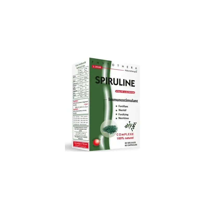 VITAL PHYTOTHERA SPIRULINE 60 GÉLULES est un complément alimentaire naturel, formulé à base de Spiruline, une micro-algue d'eau douce reconnue comme un super-aliment. Exceptionnellement riche en protéines, en vitamines, en minéraux, en antioxydants et en chlorophylle, la spiruline est un allié précieux pour combattre la fatigue, renforcer l'organisme et soutenir la vitalité au quotidien. Ce produit est un complément idéal pour les végétariens, les sportifs ou toute personne cherchant à combler des carences nutritionnelles.