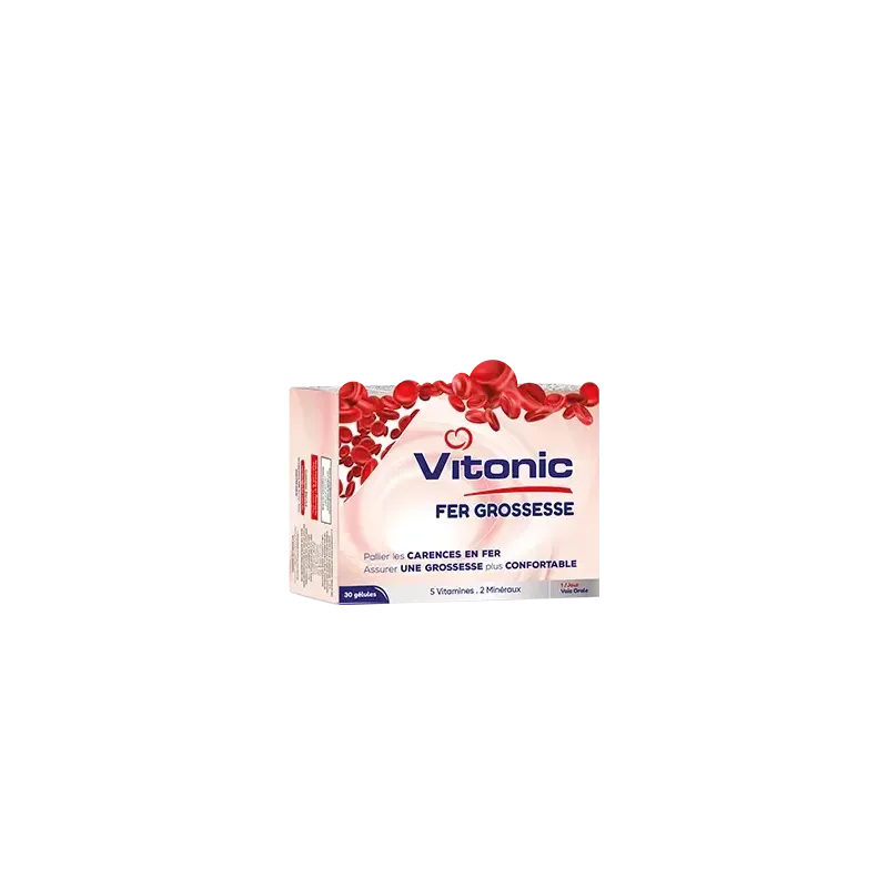 VITAL VITONIC FER GROSSESSE 30 GÉLULES est un complément alimentaire spécifiquement formulé pour répondre aux besoins accrus en fer des femmes enceintes et allaitantes. Durant la grossesse, les besoins en fer augmentent considérablement pour soutenir le développement du fœtus et prévenir l'anémie maternelle. Ce complément apporte du fer hautement biodisponible, associé à la vitamine C et aux vitamines B9 (acide folique) et B12, qui optimisent son absorption et sa bonne utilisation par l'organisme. Il aide à combattre la fatigue, essentielle pour le bien-être de la future ou jeune maman et le bon développement de l'enfant.