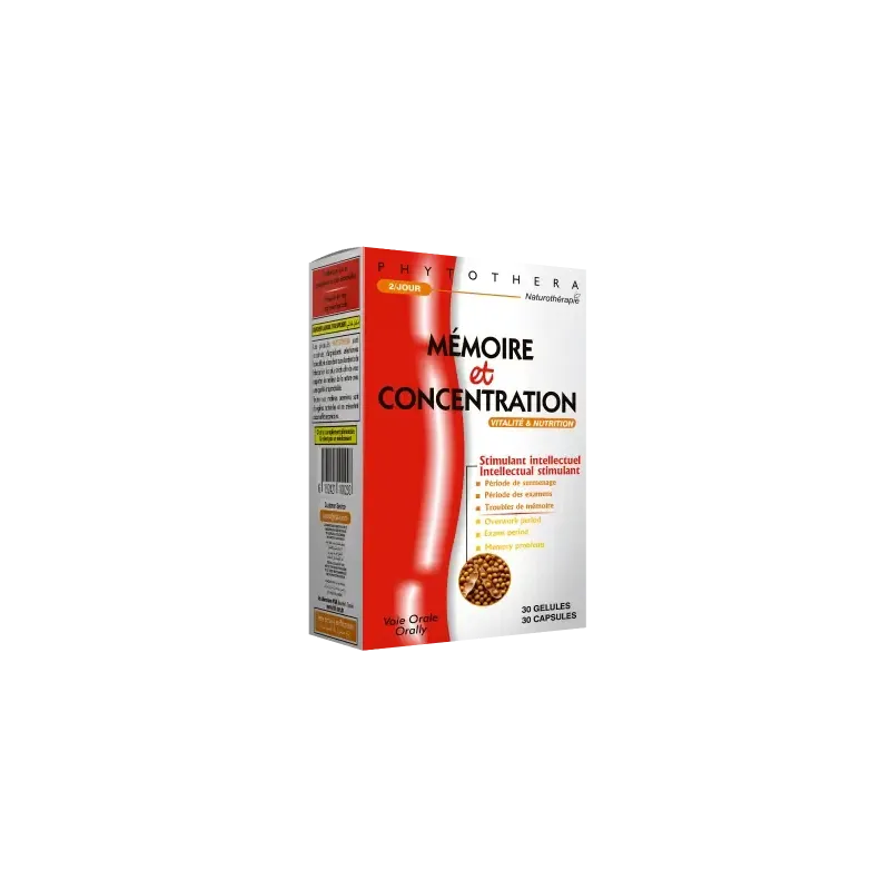 VITAL PHYTOTHERA MÉMOIRE & CONCENTRATION 30 GÉLULES est un complément alimentaire spécialement formulé pour soutenir les performances intellectuelles, la mémoire et la concentration. Sa formule est une synergie d'actifs d'origine végétale et de vitamines qui agissent sur la circulation cérébrale et le bon fonctionnement des cellules nerveuses. Ce produit est un allié précieux en période d'examen, de surmenage intellectuel ou simplement pour maintenir une bonne acuité mentale avec l'âge.