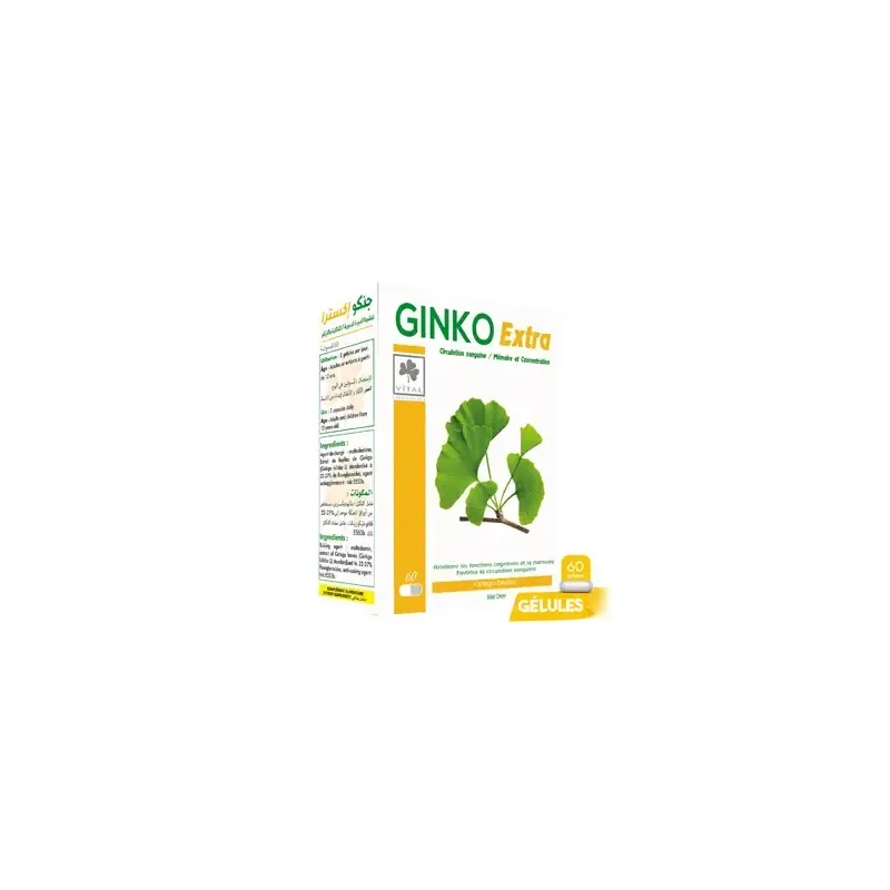 VITAL GINKO EXTRA 60 GÉLULES est un complément alimentaire formulé pour soutenir la mémoire, la concentration et la circulation sanguine. Sa formule est un concentré d'extrait de Ginkgo Biloba, une plante millénaire reconnue pour ses bienfaits sur le système circulatoire et cognitif. Ce produit est un allié précieux pour les personnes cherchant à améliorer leurs performances intellectuelles, leur vigilance et leur bien-être mental.