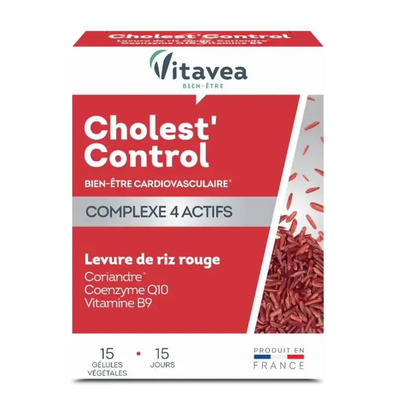 VITAVEA CHOLEST CONTROL LEVURE DE RIZ ROUGE 15 GÉLULES est un complément alimentaire conçu pour aider à maintenir un taux de cholestérol normal. Sa formule est principalement à base de levure de riz rouge, un actif naturel issu d'un champignon microscopique fermenté sur du riz. La levure de riz rouge contient de la monacoline K, une substance qui aide à réguler le taux de cholestérol. Ce produit est un allié précieux pour les personnes qui cherchent à contrôler leur cholestérol en complément d'un régime alimentaire sain et d'un mode de vie équilibré.