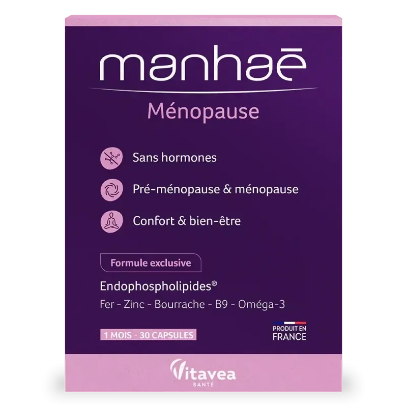 VITAVEA MANHAE MÉNOPAUSE 30 CAPSULES est un complément alimentaire de la marque Manhaé, spécifiquement formulé pour accompagner les femmes pendant la périménopause et la ménopause. Sa formule est une synergie d'actifs d'origine naturelle, de vitamines et de minéraux qui agissent pour soulager les principaux désagréments liés à cette période, sans recourir aux hormones ni aux phytoestrogènes. Ce produit est un allié précieux pour un bien-être au quotidien, en ciblant les bouffées de chaleur, la nervosité et la fatigue.