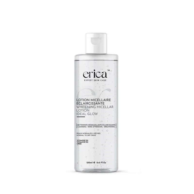 ERICA LOTION MICELLAIRE est une solution nettoyante et démaquillante, conditionnée en flacon de deux cent cinquante millilitres, qui s'inscrit dans la gamme IDEAL GLOW. Utilisant la technologie micellaire, elle est conçue pour capturer et éliminer efficacement les impuretés, le maquillage et les particules de saleté du visage et des yeux, sans nécessiter de rinçage. Cette formule délicate va au-delà du simple nettoyage grâce à une infusion d'actifs bénéfiques pour la peau. Elle contient de la Vitamine B5 (Panthénol) qui apporte une hydratation en profondeur et maintient l'équilibre d'hydratation naturel de la peau, la laissant douce et souple. La Vitamine B3 (Niacinamide) est intégrée pour ses propriétés éclaircissantes, aidant à réduire l'apparence des taches brunes et de l'hyperpigmentation, et ainsi illuminer le teint. Enfin, l'Urée, un agent hydratant efficace, pénètre en profondeur pour une sensation de confort et de fraîcheur. Délicate et non parfumée, cette lotion nettoie efficacement sans dessécher ni irriter la peau.