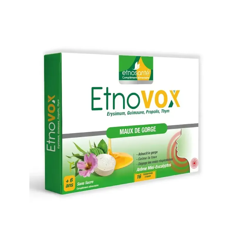 ETNOVOX Maux de Gorge d'Etnosanté est un complément alimentaire sous forme de comprimés à sucer, formulé pour apaiser et adoucir la gorge irritée. Sa composition associe des ingrédients naturels reconnus pour leurs propriétés apaisantes et purifiantes, notamment le Miel et l'Eucalyptus. Les comprimés libèrent progressivement leurs actifs au contact de la salive, procurant un soulagement immédiat et durable des sensations de picotement, de brûlure et de douleur. Le goût agréable de miel et d'eucalyptus procure une sensation de fraîcheur dans la gorge et les voies respiratoires.