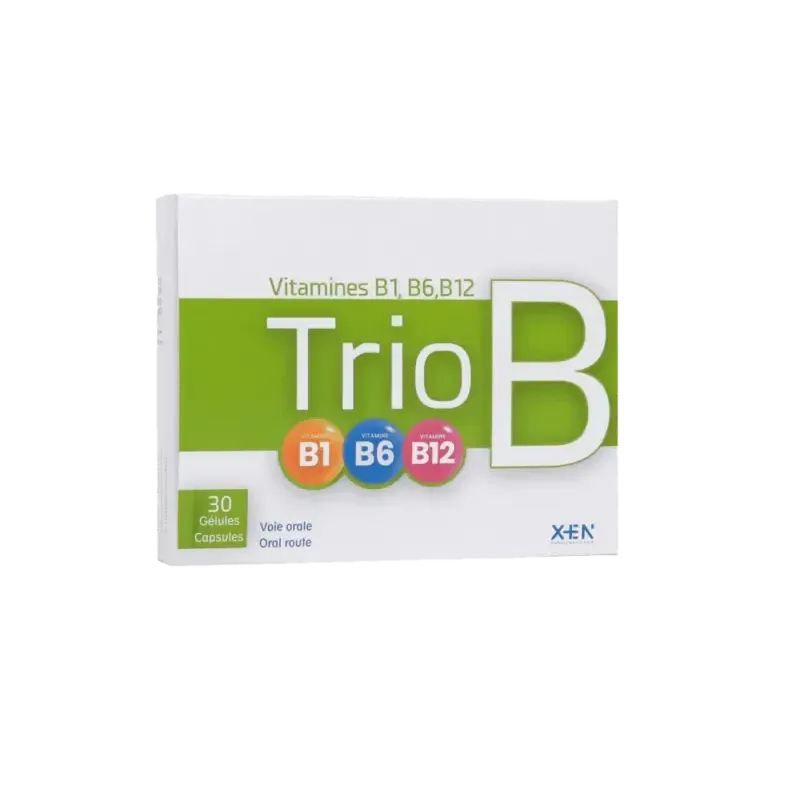 XEN TRIO B est un complément alimentaire sous forme de gélules, conçu pour soutenir le métabolisme énergétique et le bon fonctionnement du système nerveux. Sa formule concentrée associe les vitamines B1, B6 et B12, essentielles pour l'organisme. Ces vitamines agissent en synergie pour aider à la réduction de la fatigue, au bon fonctionnement du système nerveux et à des fonctions psychologiques normales. Ce complément est idéal pour les personnes souffrant de fatigue, de stress ou celles ayant des besoins nutritionnels accrus.