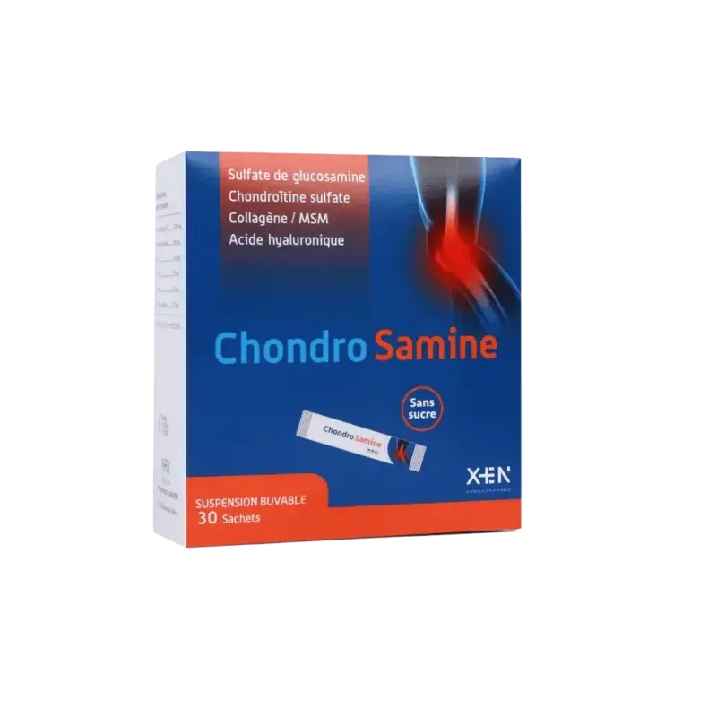 XEN CHONDROSAMINE est un complément alimentaire sous forme de sachets liquides de 10ml, conçu pour maintenir la santé des articulations et des cartilages. Sa formule unique et concentrée contient de la glucosamine, de la chondroïtine, du collagène de type II, ainsi que des vitamines et des minéraux. Ces actifs agissent en synergie pour aider à la régénération du cartilage, maintenir la flexibilité et la mobilité des articulations, et réduire les sensations de gêne. Il est idéal pour les personnes souffrant d'inconfort articulaire, les sportifs, ou les seniors souhaitant préserver leur capital articulaire.