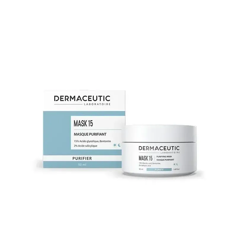 DERMACEUTIC MASK 15 est un masque sébo-régulateur et exfoliant, spécialement conçu pour les peaux grasses, à tendance acnéique et à imperfections. Sa formule, riche en acide glycolique et en argile bentonite, purifie la peau en profondeur, réduit l'excès de sébum et affine le grain de peau pour un teint plus mat et plus sain.