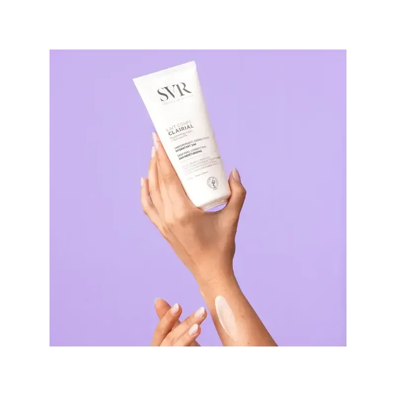 Le lait de corps CLAIRIAL de SVR est un soin dépigmentant et hydratant, conçu pour corriger et prévenir l'apparition des taches brunes sur le corps, y compris sur les zones sensibles comme le cou et le décolleté. Sa formule, dotée du complexe Clairial et de la technologie Lumi-White, agit à plusieurs niveaux pour réduire visiblement les taches et unifier le teint. Il contient des actifs puissants qui inhibent la production de mélanine et favorisent l'exfoliation en douceur des cellules chargées de pigments. Sa texture fluide et légère pénètre rapidement, offrant une hydratation intense qui dure toute la journée. La peau est nourrie, douce et le teint devient plus homogène et lumineux.