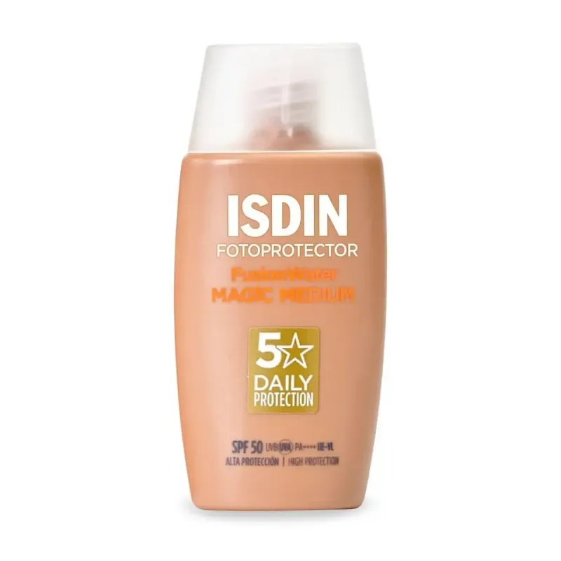L'écran solaire ISDIN PHOTOPROTECTION FUSION WATER MAGIC MEDIUM SPF50+ est un protecteur facial quotidien teinté, idéal pour unifier le teint tout en offrant une très haute protection solaire. Sa formule innovante, à base d'eau, est dotée de la technologie Fusion Water, qui garantit une absorption immédiate et une texture ultra-légère. L'indice de protection SPF50+ assure une défense très efficace contre les rayons UVA et UVB. La teinte Medium s'adapte à de nombreux types de peaux pour masquer les imperfections et unifier le teint. Enrichi en acide hyaluronique pour une hydratation intense et en vitamine E pour une action antioxydante, ce produit protège non seulement la peau des dommages du soleil, mais il aide aussi à prévenir le vieillissement prématuré. Il est formulé pour ne pas irriter les yeux, ce qui en fait un choix sûr et confortable pour un usage quotidien.