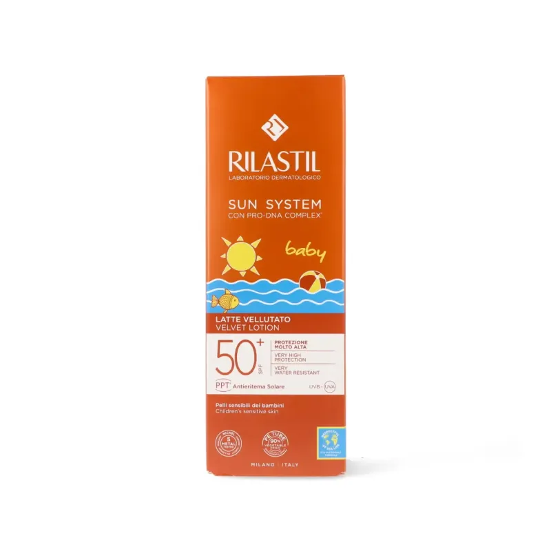 Le lait fluide RILASTIL SUN SYSTEM Bébé SPF50+ est un écran solaire spécialement formulé pour la peau délicate des bébés et des jeunes enfants. Sa formule est une combinaison de filtres solaires photostables et sûrs pour offrir une très haute protection à large spectre contre les rayons UVA et UVB, prévenant ainsi les coups de soleil et les dommages cutanés à long terme. Sa texture fluide et légère est facile à étaler, ne laisse pas de traces blanches et pénètre rapidement sans laisser de film gras ou collant. Enrichi en Pro-Défense, un complexe antioxydant qui protège les cellules du stress oxydatif, ce lait solaire aide à renforcer les défenses naturelles de la peau. Il contient également des agents émollients qui hydratent et apaisent la peau, la protégeant du dessèchement. Le produit est formulé pour être résistant à l'eau, ce qui en fait un allié parfait pour les activités aquatiques et les jeux de sable.