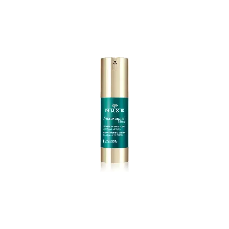 Le Sérum Redensifiant Anti-âge Global Nuxuriance Ultra de Nuxe est un soin ultra-concentré conçu pour une action anti-âge intense sur les peaux matures. Ce sérum a une texture soyeuse et pénètre rapidement, offrant une sensation de confort immédiat. Sa formule est une synergie d'actifs puissants qui agissent en profondeur pour lisser, repulper et raffermir la peau.
