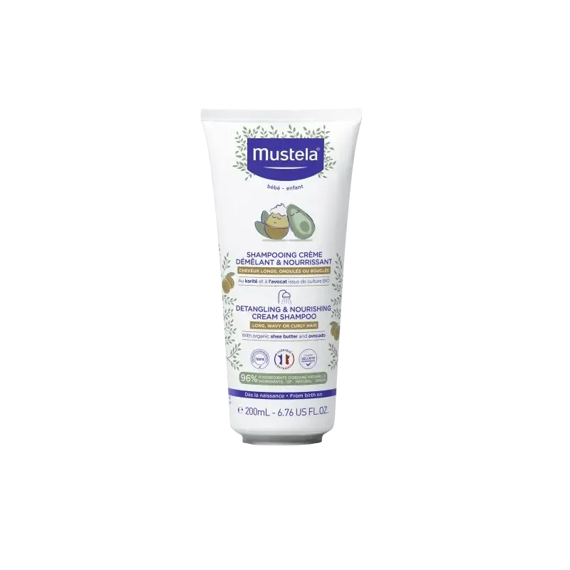 Shampooing-crème Mustela pour cheveux longs, bouclés ou ondulés de bébé et enfant, formulé à 96 % d'ingrédients d'origine naturelle (Beurre de Karité BIO, Huile d'Avocat BIO) pour nettoyer en douceur, nourrir et démêler instantanément sans alourdir ni piquer les yeux.
