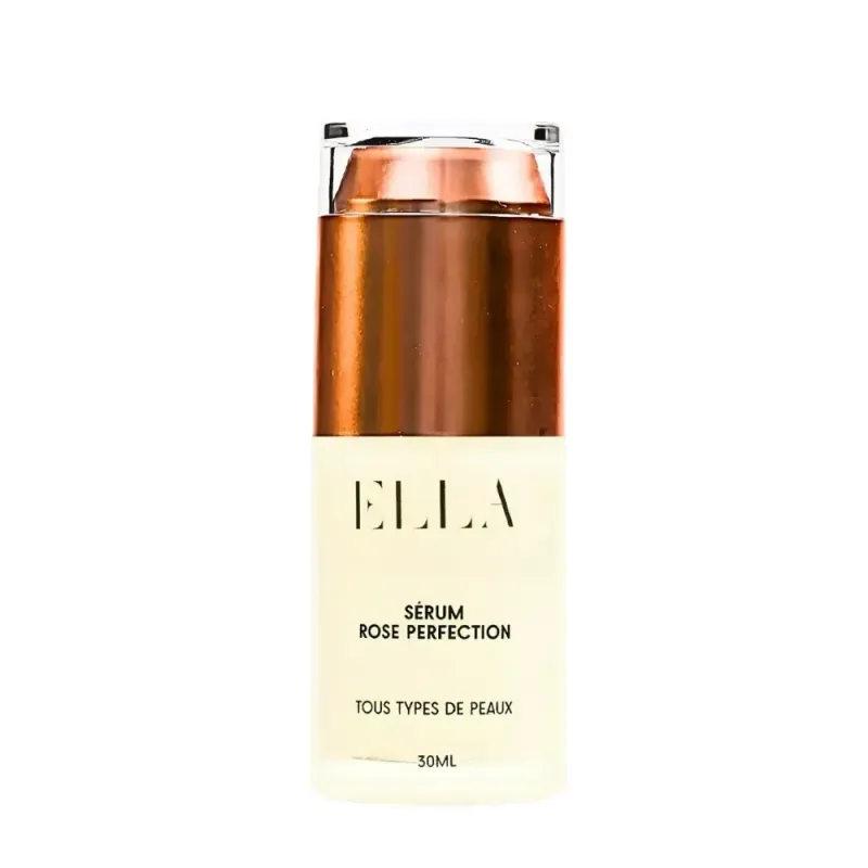 Le Sérum Rose Perfection ELLA est un soin visage concentré présenté dans un flacon de 30 ml. Il est décrit comme un sérum "révolutionnaire tout-en-un" qui cible simultanément de multiples problématiques cutanées. Sa formule à base d'extraits naturels de rose est enrichie en actifs puissants tels que la Protéine de Soie et la Vitamine E. Ce sérum vise à améliorer la qualité globale de la peau en agissant sur l'éclat, l'hydratation, la fermeté et les signes visibles de l'âge comme les rides, les ridules et les pores. Sa texture fluide et légère est conçue pour une pénétration rapide, sans laisser de film gras, assurant une action ciblée et préparant parfaitement la peau à l'application des soins suivants. Il est formulé pour convenir à tous les types de peaux, y compris les plus sensibles.