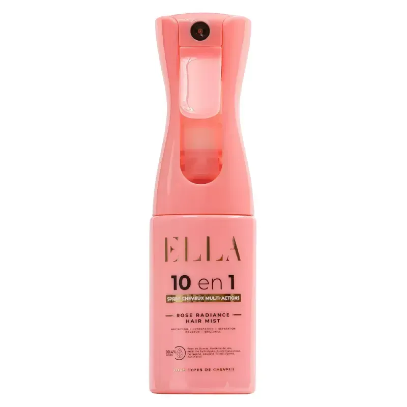 Le ELLA Rose Radiance Hair Mist est un spray capillaire Multi-Actions 10 en 1 formulé pour le soin quotidien de tous les types de cheveux, y compris les cheveux secs, abîmés ou sensibles. Ce soin sans rinçage, enrichi en Eau Florale de Rose de Damas et en actifs nourrissants, agit comme un bouclier protecteur et un embellisseur de la chevelure. Il offre une hydratation intense et une nutrition profonde, tout en protégeant les cheveux des agressions extérieures telles que les rayons UV, le sel, le chlore et la chaleur des appareils de coiffage. Il facilite le démêlage, discipline les frisottis et laisse les cheveux incroyablement doux, souples, renforcés et enveloppés d'un délicat parfum de rose.