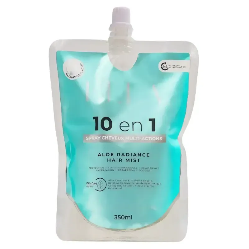 Ceci est la recharge 350 ml du spray capillaire sans rinçage Aloe Radiance Hair Mist ELLA pour cheveux colorés et méchés, offrant une solution économique et écologique pour hydrater, protéger et prolonger la tenue de la couleur.
