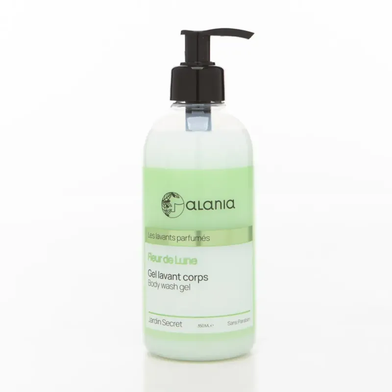 Le Gel Lavant Corps Fleur de Lune d'ALANIA est un soin de douche qui transforme le nettoyage quotidien en un véritable rituel sensoriel. Sa texture est onctueuse et crémeuse, se transformant au contact de l'eau en une mousse fine et délicate. Il est conçu pour nettoyer la peau en douceur sans la dessécher, tout en respectant son équilibre cutané, notamment grâce à une formule souvent sans paraben. Son parfum est la signature "Fleur de Lune", une fragrance subtile, florale et apaisante qui mélange la fraîcheur des herbes d'eau et des fleurs blanches à la chaleur et la profondeur du musc et du santal. Ce gel lavant procure une sensation de détente et laisse la peau du corps propre, douce et délicatement parfumée.
