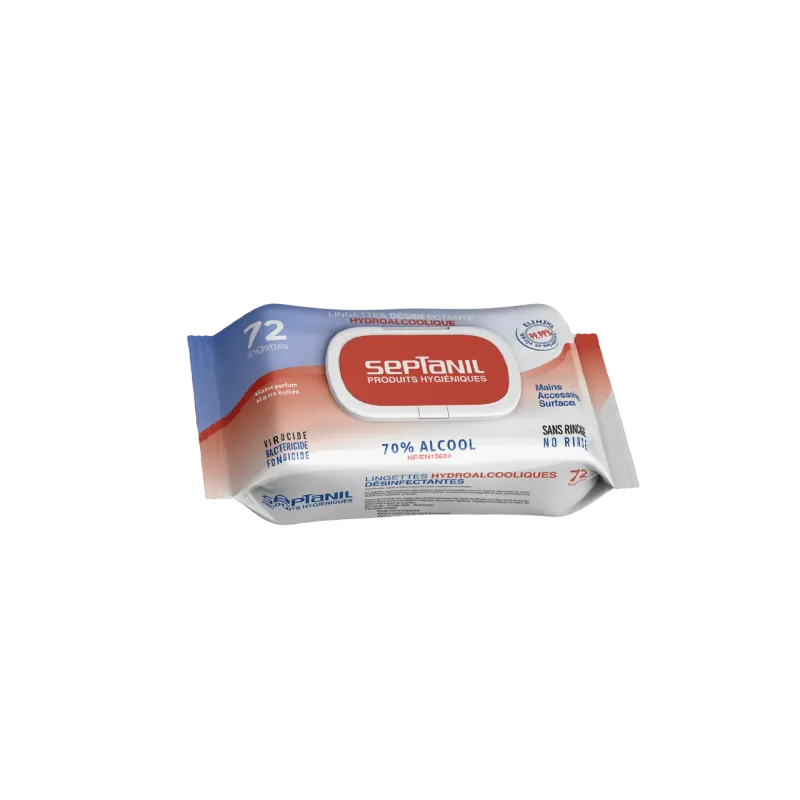 Les SEPTANIL LINGETTES DÉSINFECTANTES SOLUTION HYDROALCOOLIQUE 70% ALCOOL sont des lingettes prêtes à l'emploi conditionnées en boîte de 72, destinées à la désinfection rapide et efficace des surfaces, des dispositifs médicaux non invasifs, et des mains. Imprégnées d'une solution à base de 70% d'alcool (hydroalcoolique), elles garantissent une action puissante contre les bactéries, les mycobactéries, les champignons (levuricide) et les virus, éliminant jusqu'à 99,9% des germes. Leur formule permet un séchage rapide sans rinçage, ne laissant ni film gras ni résidu. Elles sont pratiques pour maintenir une hygiène impeccable en toutes circonstances, que ce soit en milieu professionnel, médical ou au quotidien.