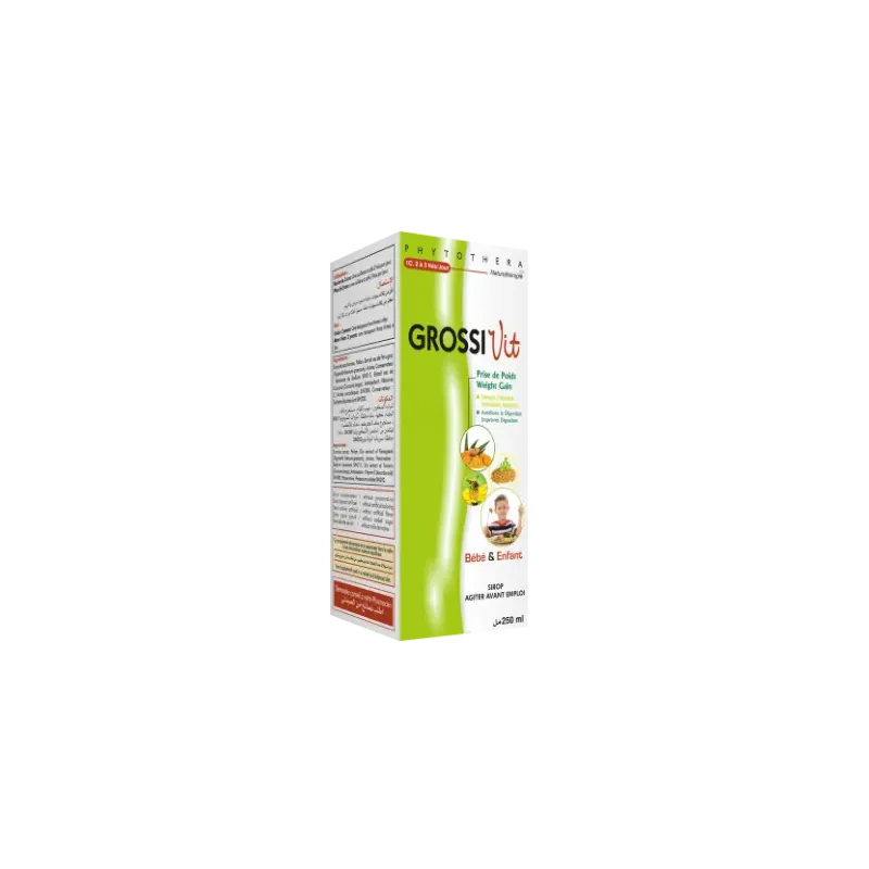 Le VITAL PHYTOTHERA GROSSIVIT SUSPENSION 250ML est un complément alimentaire sous forme de sirop buvable, élaboré par les Laboratoires Vital dans leur gamme Phytothera. Il est spécifiquement formulé pour stimuler l'appétit, faciliter la prise de poids et améliorer la digestion, notamment chez les enfants et les adultes ayant des difficultés à prendre du poids ou souffrant d'un manque d'appétit. Sa composition est riche en ingrédients naturels traditionnellement utilisés pour leurs vertus nutritives et stimulantes. La suspension garantit un apport précieux en éléments nutritifs essentiels, soutenant ainsi une croissance et une prise de poids saines et équilibrées.