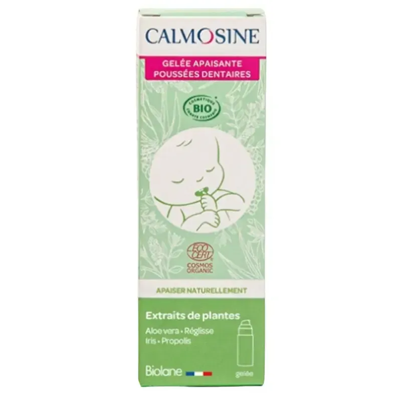 La Calmosine Gelée Apaisante Poussées Dentaires Bio est un soin oral spécialement conçu pour les nourrissons et les jeunes enfants afin de soulager les désagréments liés à l'éruption des premières dents. Présentée dans un flacon pompe airless de 15 ml (contenant environ 60 doses), cette gelée utilise un complexe d'extraits de plantes 100% d'origine naturelle et biologique. Elle agit directement sur les gencives pour les adoucir et les apaiser, rendant le processus des poussées dentaires plus confortable pour bébé et facilitant ainsi la percée des dents. Sa formule est élaborée pour apporter un soulagement rapide et une haute tolérance, sans sucres ajoutés ni arômes artificiels.
