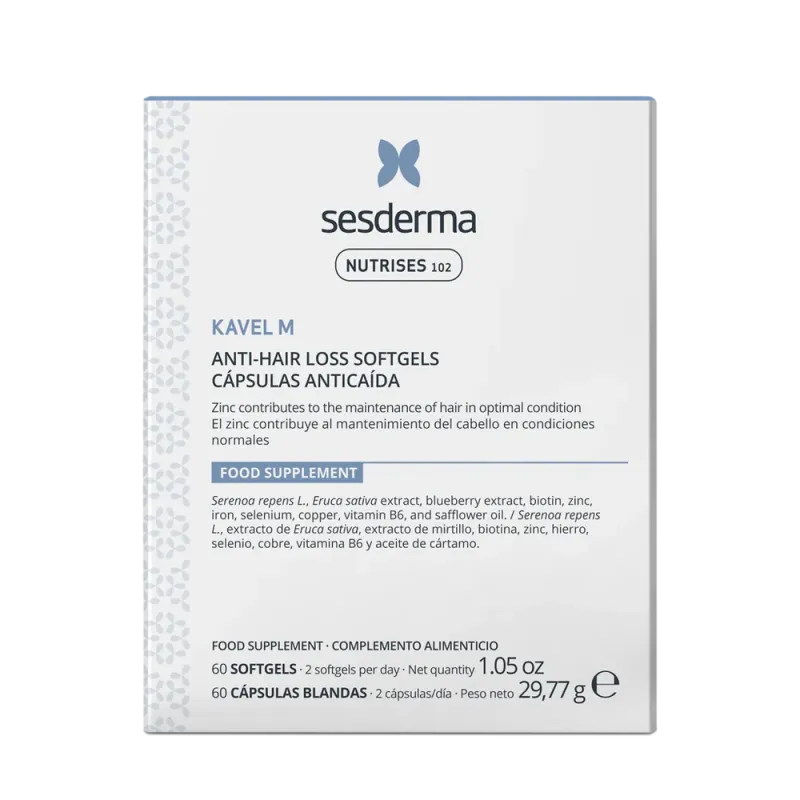 Le SESDERMA KAVEL M 60 CAPSULES est un complément alimentaire de nutricosmétique conçu pour cibler spécifiquement la chute de cheveux (alopécie) et le manque de volume. Sa formule unique est basée sur des extraits végétaux, des acides aminés et des vitamines clés, visant à fortifier la chevelure de l'intérieur. Il se distingue par l'incorporation d'extrait de Sabal (Saw Palmetto), de Taurine et de Quinoa. Ce complément est particulièrement recommandé pendant les périodes de perte de masse capillaire accrue et pour les cheveux qui manquent de densité et de force. Il agit en stimulant le follicule pileux, en contribuant à la normalisation de la chute et en améliorant l'épaisseur du cheveu.