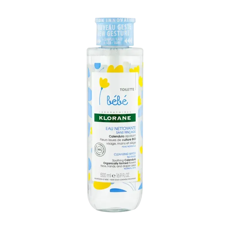 L'Eau Nettoyante Sans Rinçage Klorane Bébé est une eau micellaire formulée pour la toilette quotidienne et tout en douceur de la peau fragile des nourrissons et des bébés, dès la naissance. Alternative pratique au bain, elle permet d'éliminer efficacement et en un seul geste toutes les impuretés (salissures, résidus de crème, etc.) du visage, des mains et du siège. Enrichie en Extrait de Calendula apaisant issu de culture BIO et en actifs hydratants naturels, elle nettoie tout en évitant le dessèchement de l'épiderme. Sa formule ultra-légère ne colle pas, laisse la peau propre, souple, apaisée et délicatement parfumée du parfum tendre et relaxant breveté de la gamme Klorane Bébé. Le flacon de 500 ml est souvent équipé d'une pompe pratique "une seule main" pour une utilisation simplifiée et plus sûre lors du change.