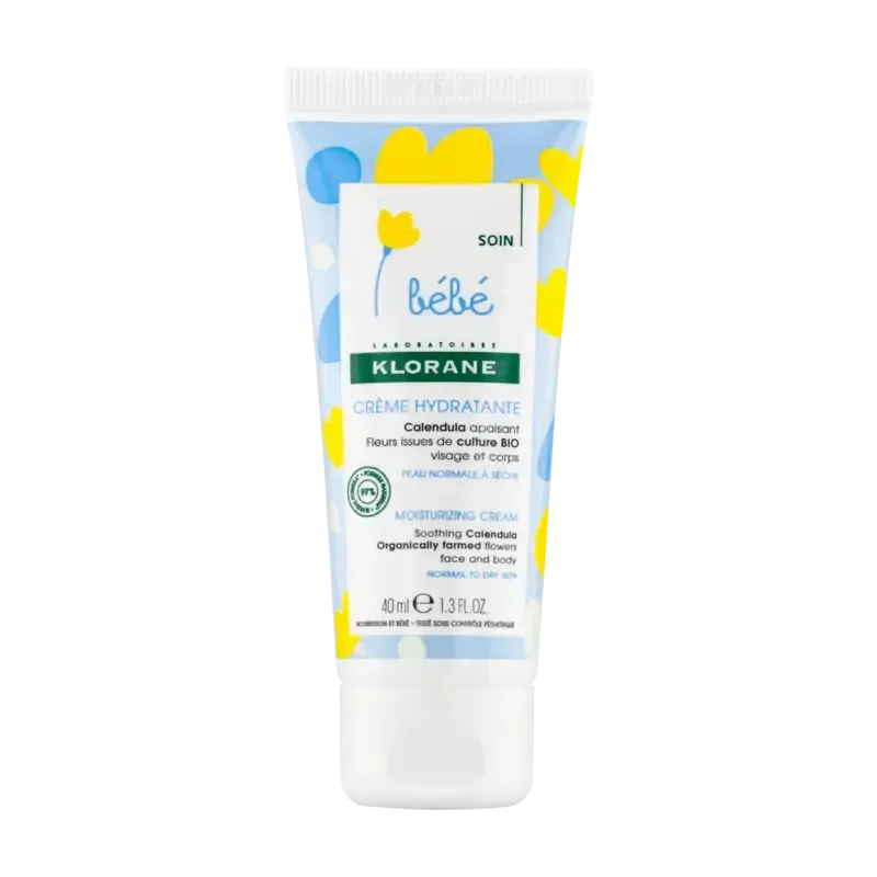 La Crème Hydratante Klorane Bébé en format 40ml est un soin quotidien conçu pour l'hydratation du visage et du corps des nourrissons et des bébés, même dès la naissance. Sa formule, souvent riche en Extrait de Calendula apaisant (issu de culture BIO) et en agents hydratants naturels (comme la Glycérine végétale), assure une hydratation intense et durable. Elle pénètre rapidement grâce à sa texture fondante et non collante, laissant la peau souple et confortable. Ce soin a pour mission de renforcer la barrière cutanée fragile du bébé, de la protéger du dessèchement et des agressions extérieures (vent, froid) tout en l'apaisant. Elle est testée sous contrôle pédiatrique pour garantir une très haute tolérance. Le petit format 40ml est idéal pour le voyage ou à glisser dans le sac à langer.
