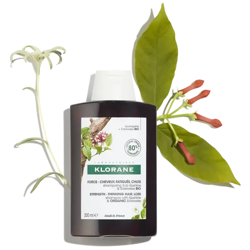 Le Shampooing Traitant Fortifiant à la Quinine & Edelweiss BIO de Klorane est un soin essentiel de la routine anti-chute et fortifiante, spécifiquement destiné aux cheveux fatigués, dévitalisés, et en complément des traitements contre la chute des cheveux. Ce shampooing est un véritable concentré de force et de vitalité. Il associe l'extrait de Quinquina (riche en Quinine), traditionnellement reconnu pour ses propriétés fortifiantes et stimulantes du bulbe pilaire, à l'Edelweiss BIO, un actif aux puissantes vertus antioxydantes qui renforce la résistance du cheveu. Introduit dans une base lavante très douce et sans tensioactifs sulfatés, il nettoie délicatement tout en stimulant la croissance et en fortifiant la fibre capillaire. Il redonne vigueur, résistance et facilite le démêlage.