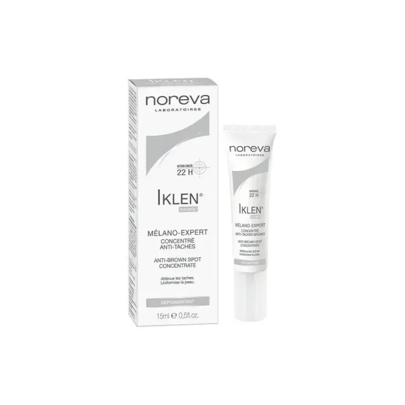 Le NOREVA IKLEN+ MELANO EXPERT CONCENTRÉ ANTI-TACHES BRUNES 15ML est un soin ciblé intensif conçu pour corriger et prévenir l'apparition des hyperpigmentations localisées telles que le mélasma (masque de grossesse), les lentigos (taches de vieillesse) et les taches pigmentaires dues au soleil ou aux cicatrices. Fortement concentré, ce soin utilise une synergie d'actifs dépigmentants pour agir sur les trois mécanismes de la mélanogénèse : il freine la production excessive de mélanine, désactive les cellules pigmentaires et limite la migration de la mélanine vers la surface de l'épiderme. Sa texture concentrée permet une application précise sur les taches, unifiant ainsi le teint et redonnant de l'éclat à la peau.