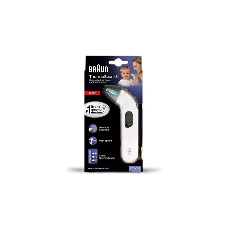 Thermomètre auriculaire infrarouge Braun ThermoScan 3 (IRT3030) offrant une mesure rapide en une seconde, une précision cliniquement prouvée grâce à la technologie ExacTemp™, un témoin sonore de fièvre, et la mémoire de la dernière lecture.
