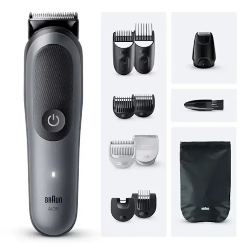 Tondeuse multifonction Braun AIO5560 Series 5, kit 11-en-1 rechargeable, 100 % étanche (AquaGrip), doté d'une lame ultra-affûtée et de la technologie SkinGuard pour le corps, offrant 120 minutes d'autonomie et 14 réglages de longueur pour un style complet de la tête aux pieds.
