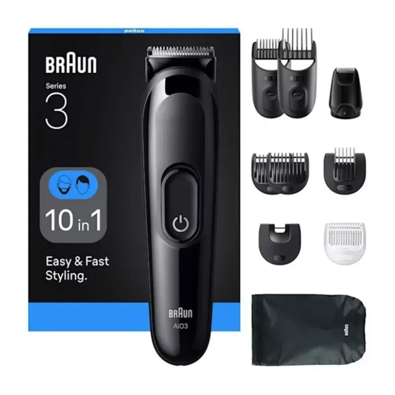 Tondeuse multifonction Braun AIO3560 10-en-1, kit complet pour le visage, les cheveux et le corps, doté de 14 réglages de longueur, d'une lame ultra-affûtée et d'une autonomie de 50 minutes.